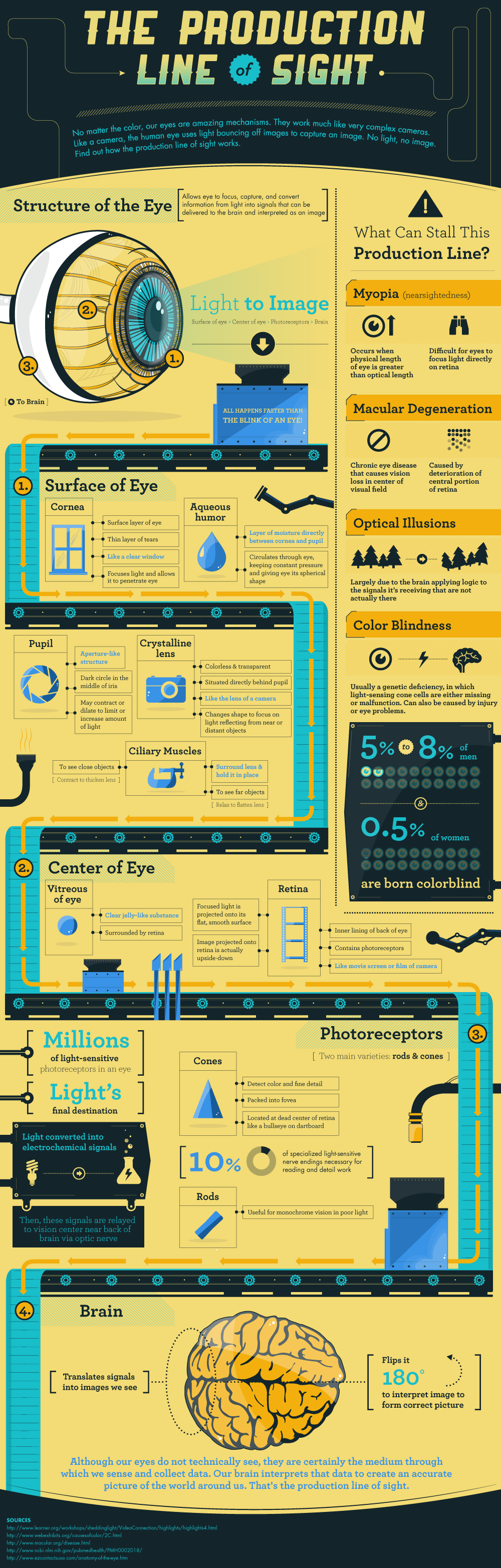 The Production Line of Sight. Structure of the Eye. Light to Image. Surface of Eye, Center of Eye, Brain. Myopia, Macular Degeneration, Optical Illusions. Color Blindness: 5%-8% of men, 0.5% of women.